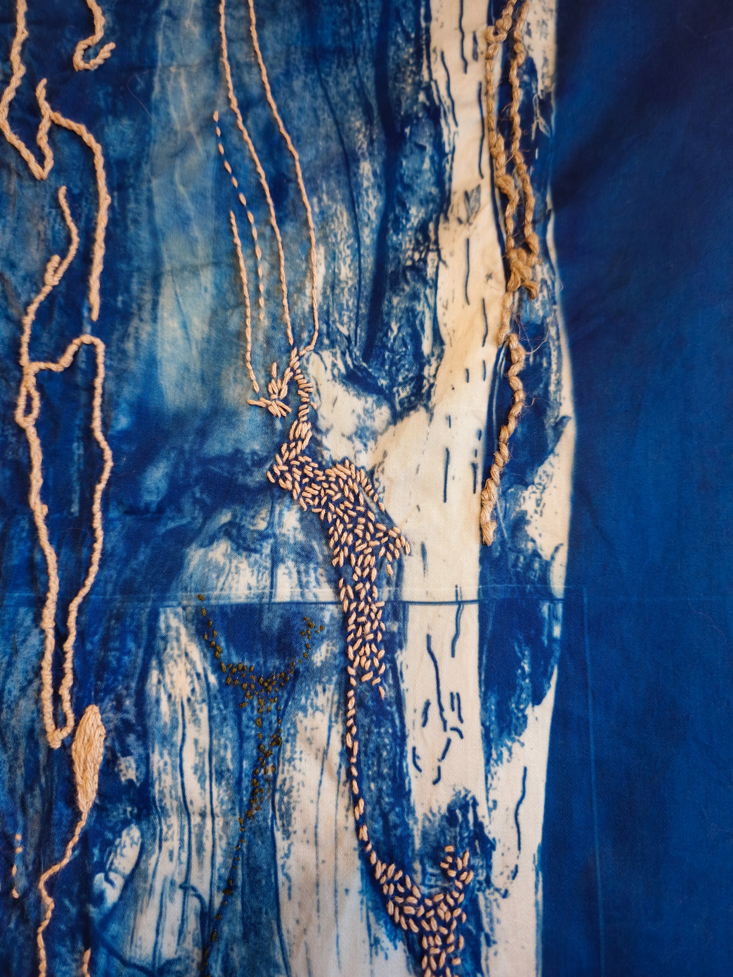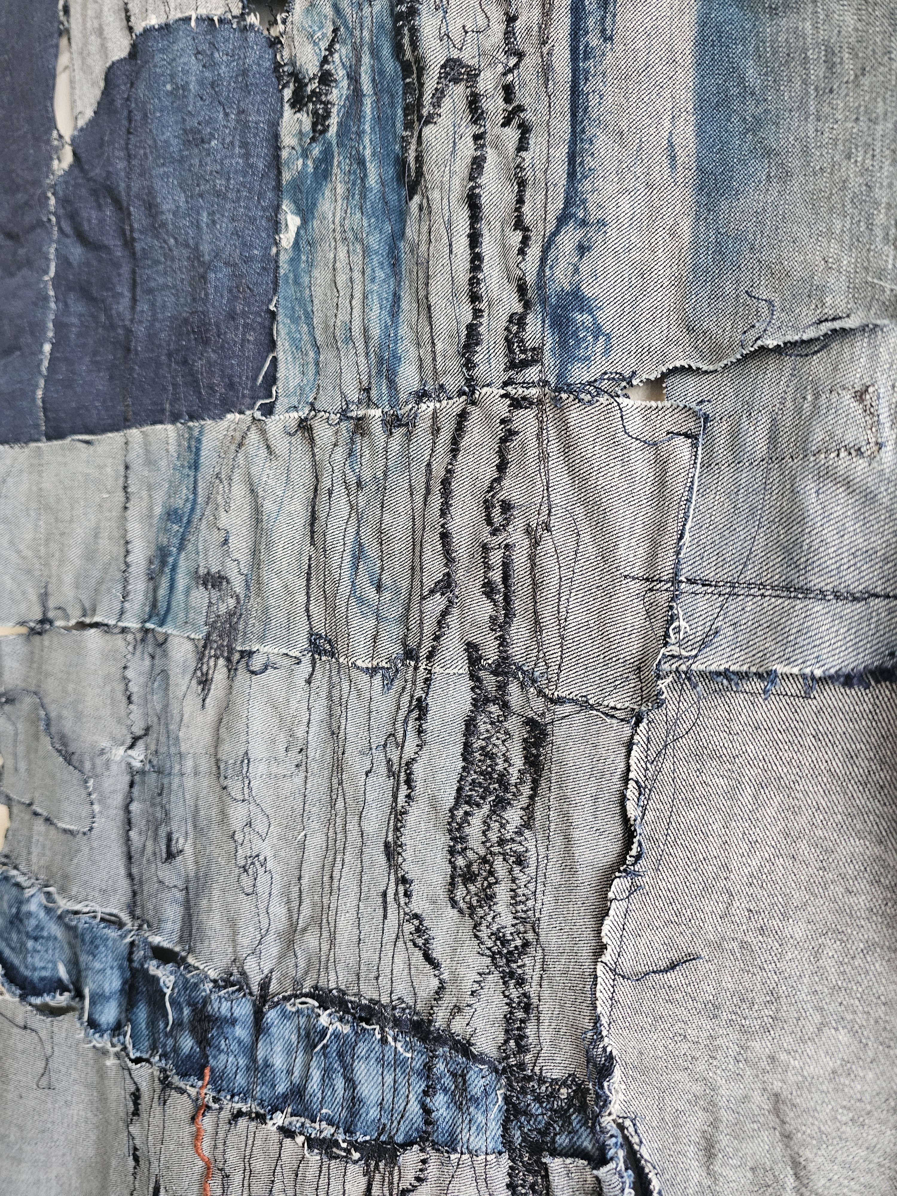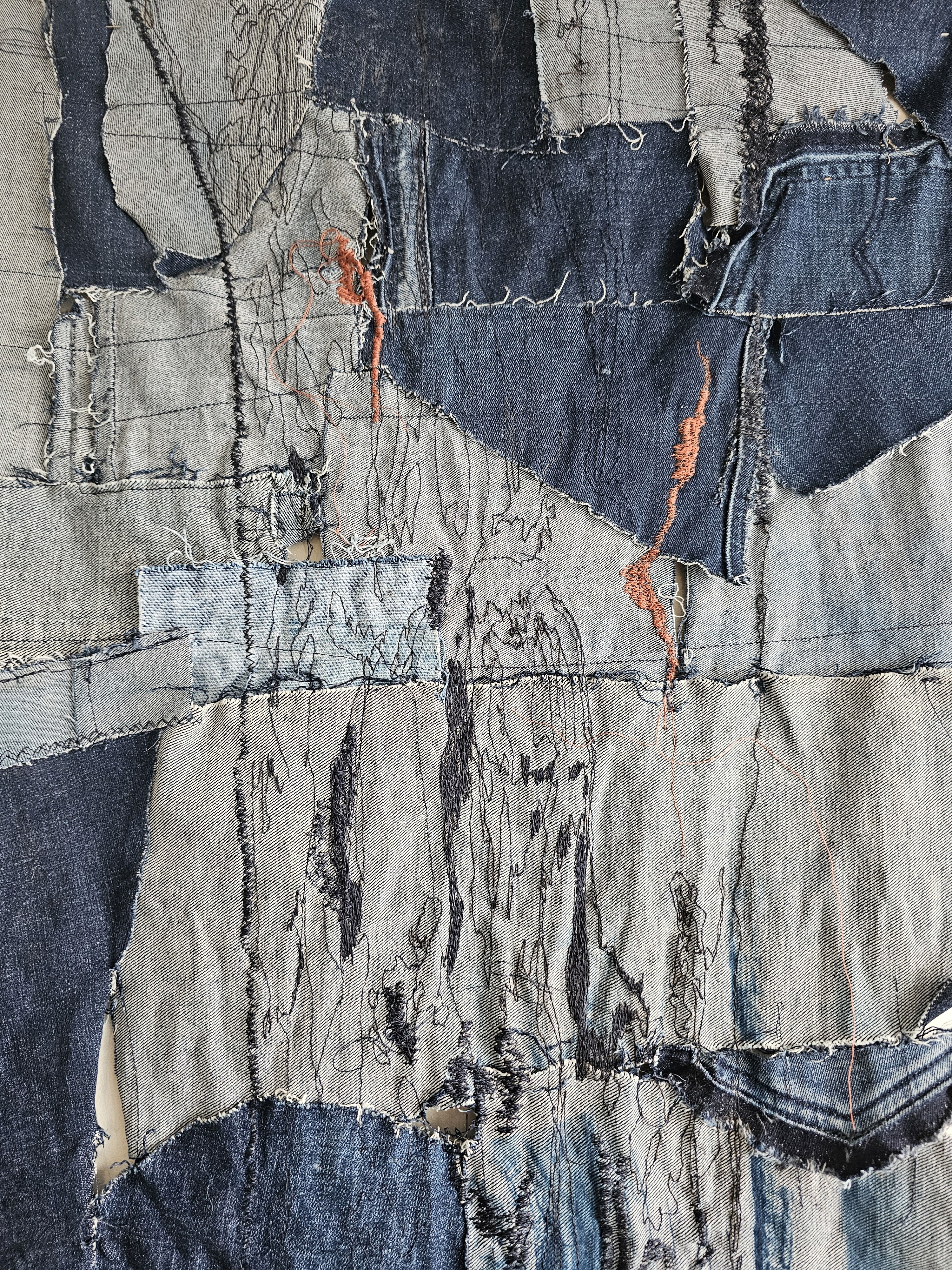 Denim scraps, cyanotype traces, and free-motion machine embroidery