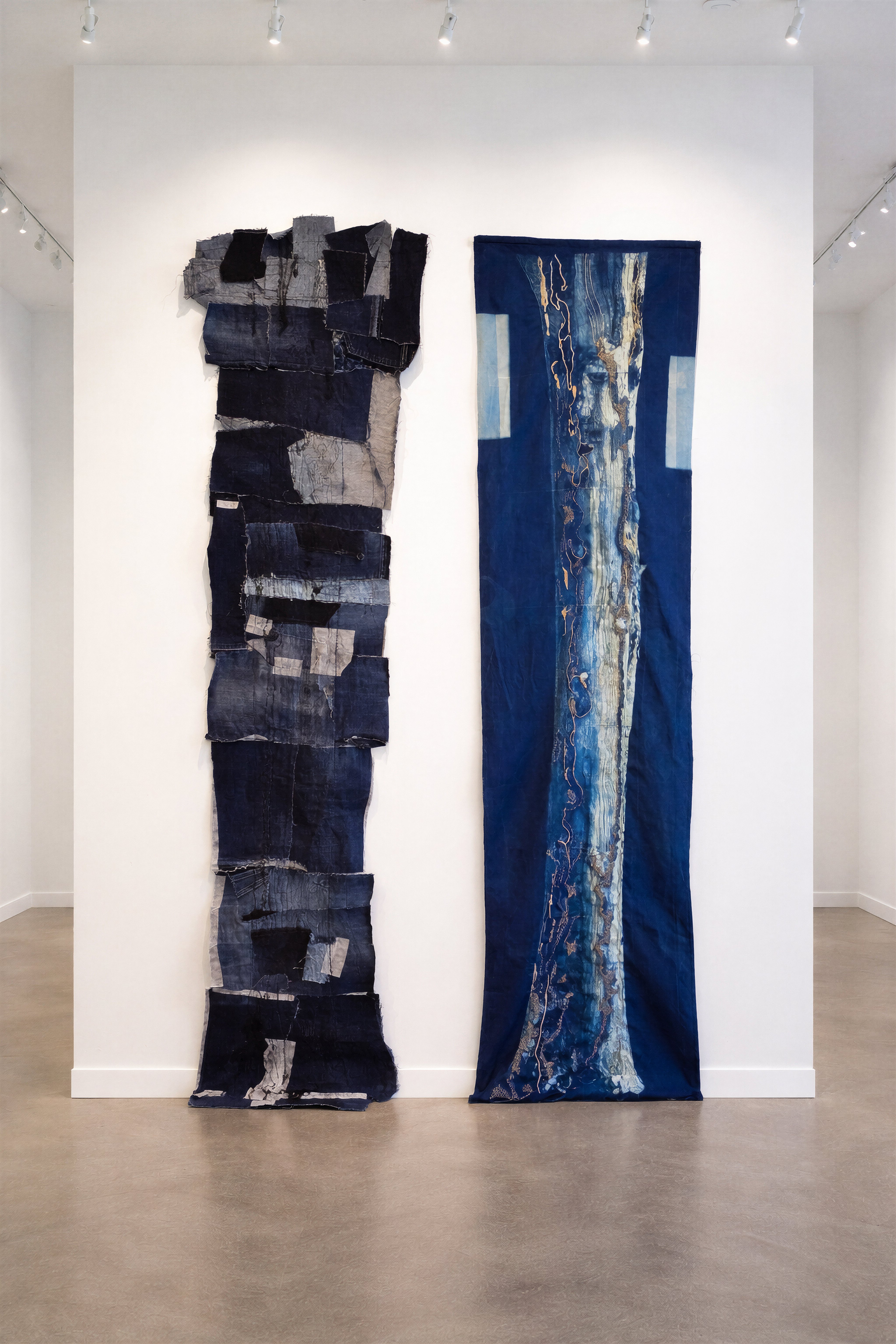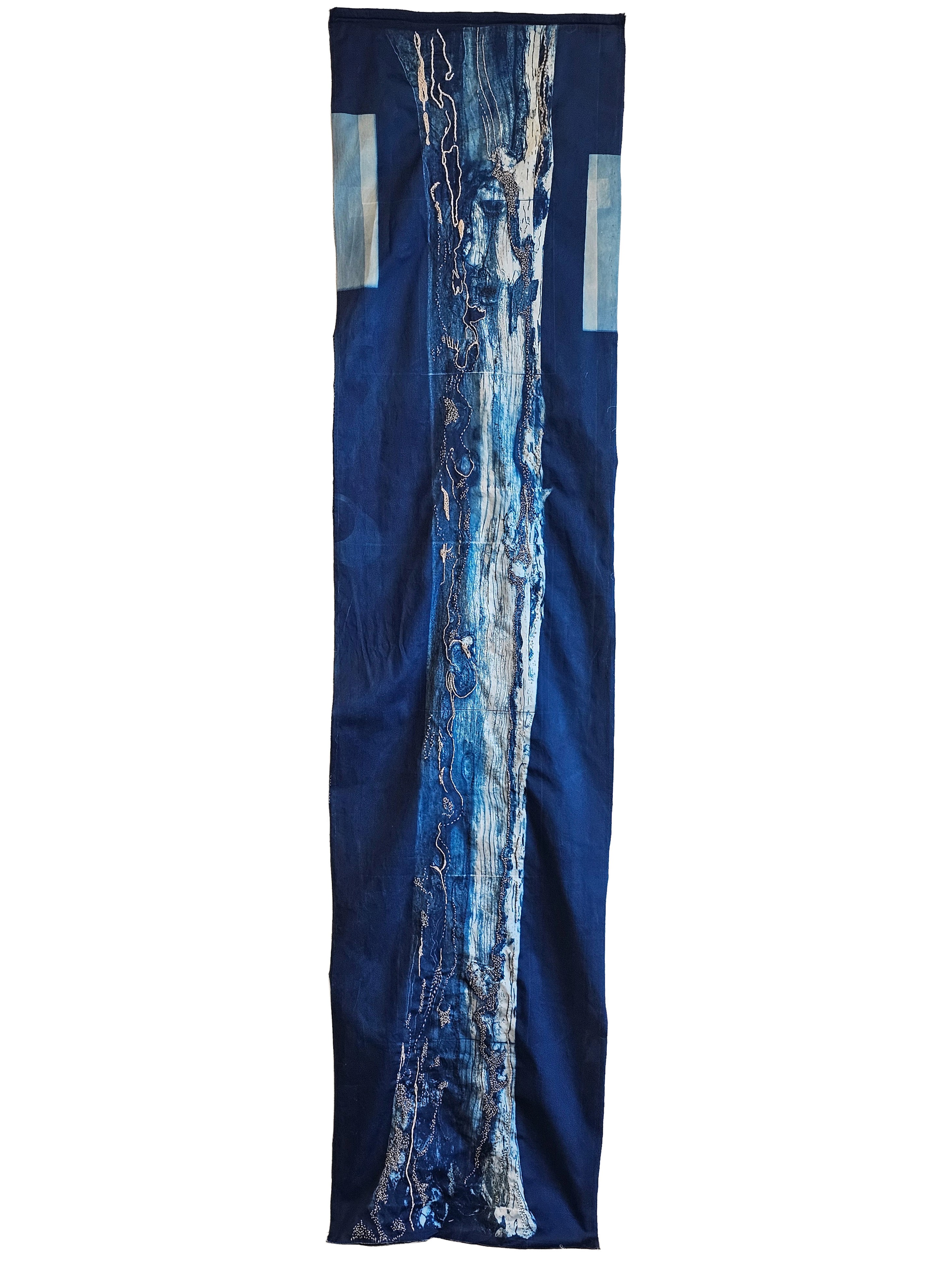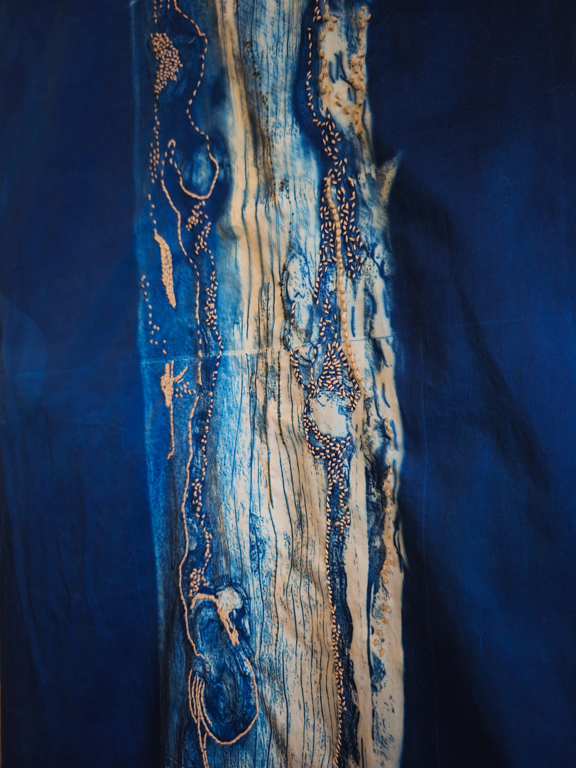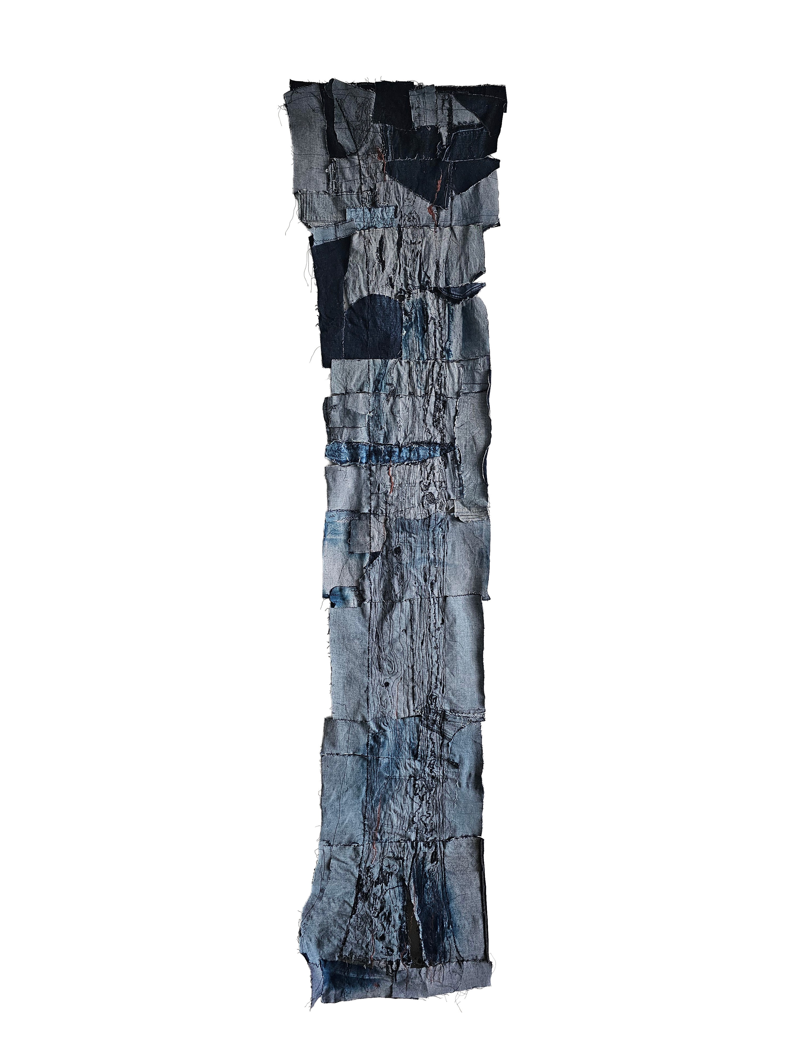 Denim scraps, cyanotype traces, and free-motion machine embroidery